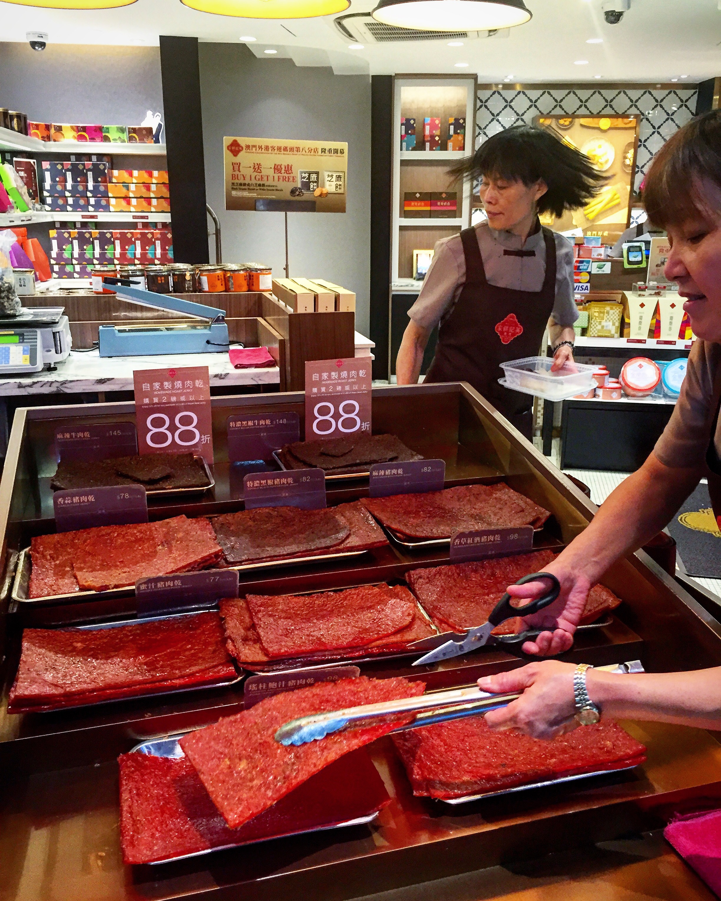 The ground below me began to evolve from broken up grey concrete to a path filled with white and black stones. The structure of the buildings held such a strong Mediterranean influence, pastel colors of pinks, blues, and yellows stained the walls. I was in Portugal, at least a place that resembled a part of it. Stores and shops filled the buildings, the street vendors hiding quietly in the alley ways, the smell of noodles, fish balls, and pork jerky lingering in the air. I was on the path to food heaven sampling pieces of delicacies the sales people would hold out to you to lure you in. Every corner we turned, we’d stumble upon remains of art work describing the tragic history of Senado Square during the Ming and Qing Dynasty under the Portuguese rule over the Chinese.
