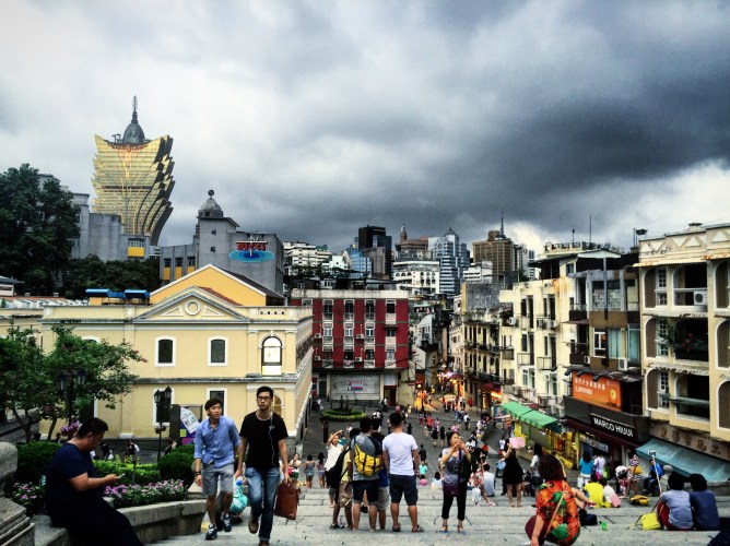 As we kept walking up the road, we stumbled upon a cobbled stone stairway that would lead us up to the ruins of St. Paul. The remains of what was a church built by Asian Christians in the 1600’s is now a wall the fire in the early 1800’s left behind. Leading up to the ruins, green hedges arranged in a unique pattern hugged the right side of the staircase. Walking up each step my eyes focused on the church in amazement. Finally making it to the top, I turned around and embraced the sight of the square ahead of me. Imagining what it had looked like several years ago. I closed my eyes, listened, and was blown away by the storm that was about to pass through.